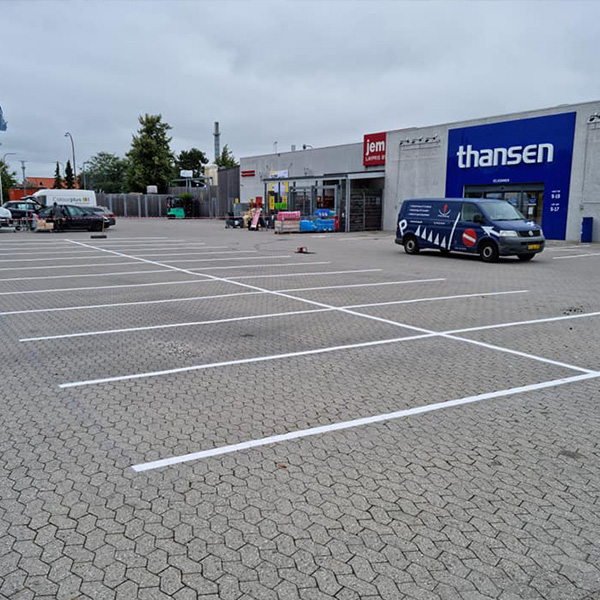 Vi anvender 3 typer af materiale til opstribning af parkeringsbåse. Termoplast, vejstribemaling eller markeringssøm.